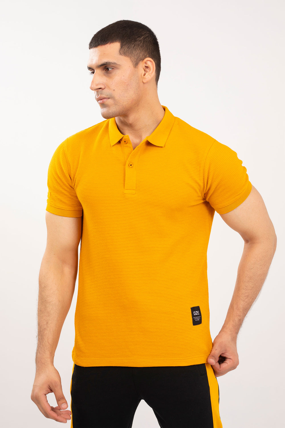 Basic polo in textured fabrication, featuring front buttoned placket with logo patch