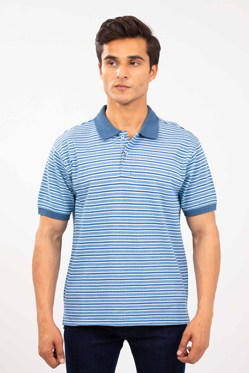 Comfort fit polo in printed pique fabrication, featuring front buttoned placket with collar