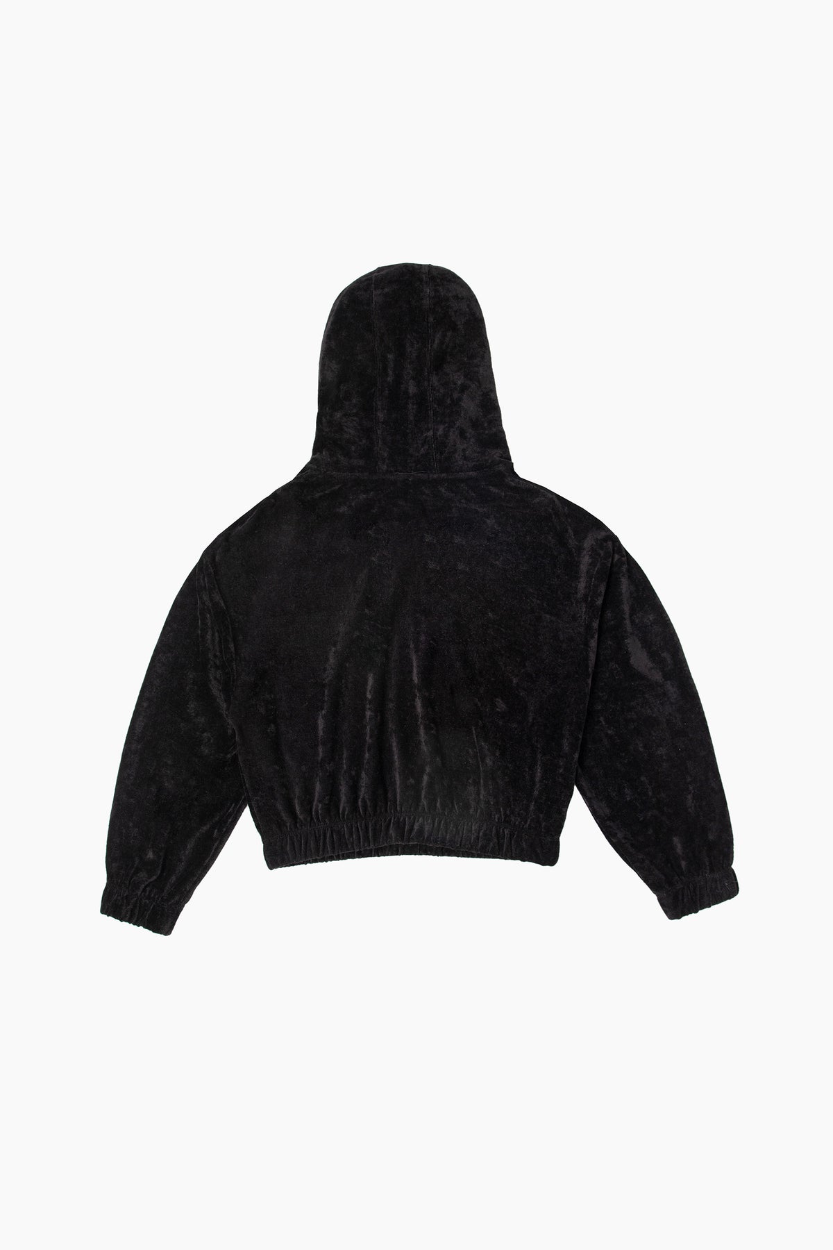 Baggy fit cropped pullover hoodie in velour fabrication, featuring drawcorded hood and ribbed hem