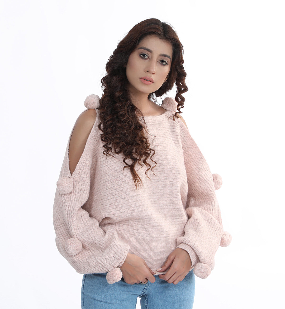 Boat neck sweater in blended knit, featuring pom pom detailing on shoulder and sleeves