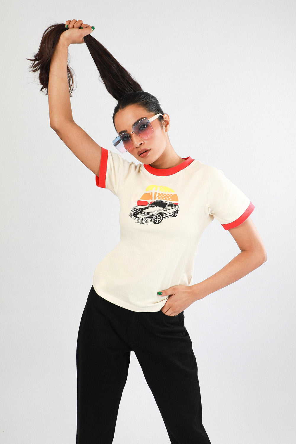 Round neck tee shirt in jersey fabrication, featuring print in front and raglan sleeves